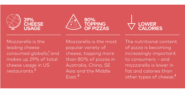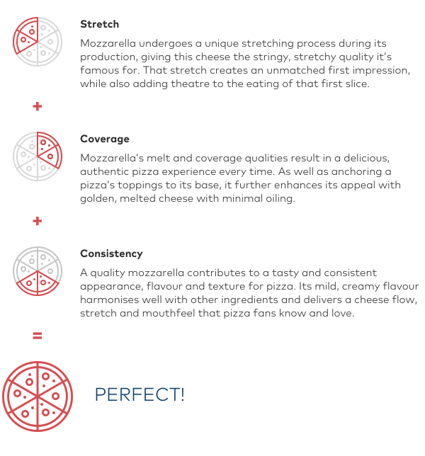 Mozzarella delivers a unique mouthfeel while holding a pizza’s ingredients together, and its creamy, mild flavour complements those other ingredients, rather than overpowering them.