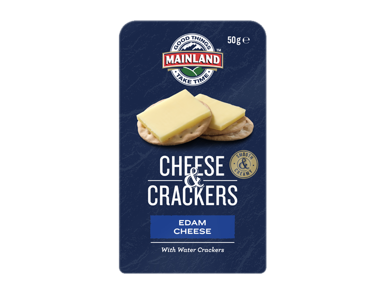 Edam cheese 62% [milk, salt, cultures, enzyme (non-animal rennet)], water crackers 38% {biscuit flour [wheat flour, minerals (iron, zinc), vitamins (niacin, thiamin, riboflavin, folate)], vegetable fats and oil [contains antioxidants (307b, 322 (soy))], iodised salt, raising agent (500)}.