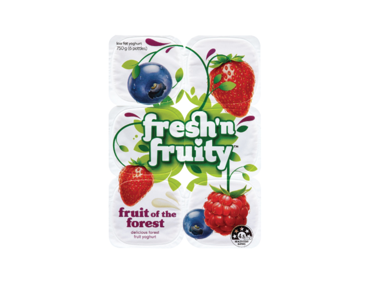 Skim milk, sugar, cream, fruit (3.0%) (strawberry (2.0%), blueberry (0.5%), raspberry (0.5%)), thickeners (1442, 412), gelatine, flavour, fruit juice concentrates (0.2%) (blackcurrant (0.1%), boysenberry (0.1%)), acidity regulators (330, 332), live cultures (including acidophilus and bifidus), preservative (202).