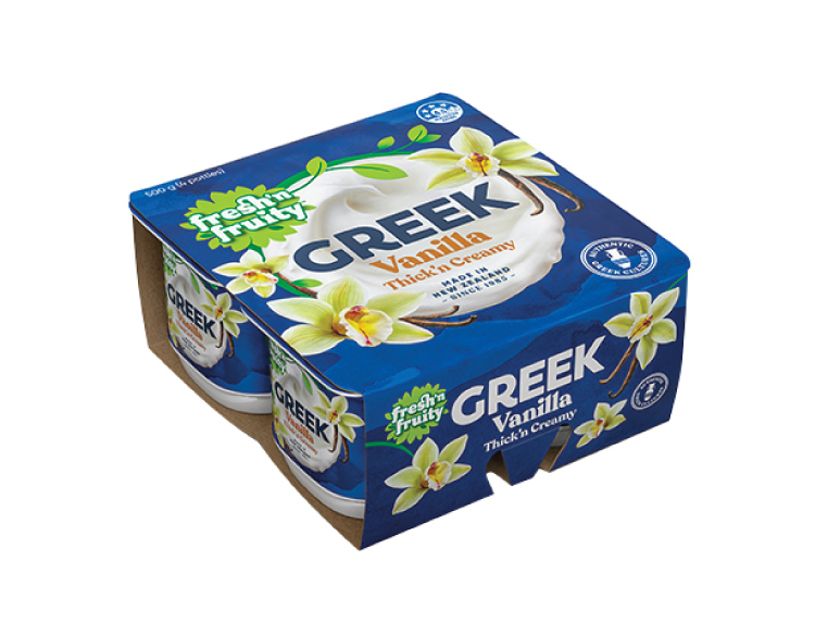 Skim milk, sugar, cream (from milk), water, milk solids, thickener (1442), flavour, live cultures (including S. thermophilus DC 29 strain from artisanal Greek yoghurt, L. bulgaricus and L. acidophilus), preservative (202), vanilla bean seeds (0.01%), acidity regulators (330, 331).